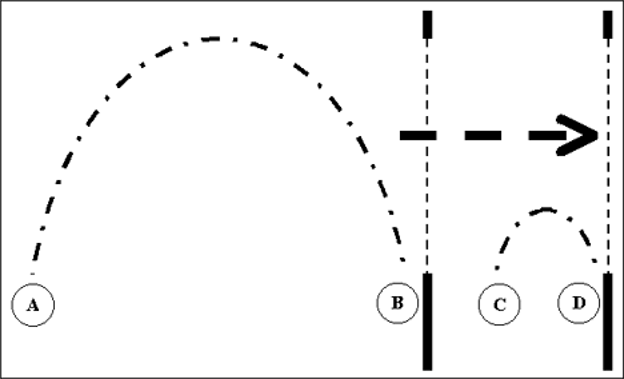 Figure 1. The Wang experiment: A light pulse A-B is timed when its leading edge B and its trailing edge A enter the opening of a chamber (near B in the figure), moving in the direction of the arrow. The leading edge D and trailing edge C of the same pulse, now weaker, are also timed when they exit the chamber through another opening on its far wall (near D in the figure). The leading edge BgD travels through the chamber at the speed of light, c. Because the pulse shape is retained but its amplitude is weaker, the trailing edge AgC appears to travel faster than c. In fact, C exits the chamber before A enters it.