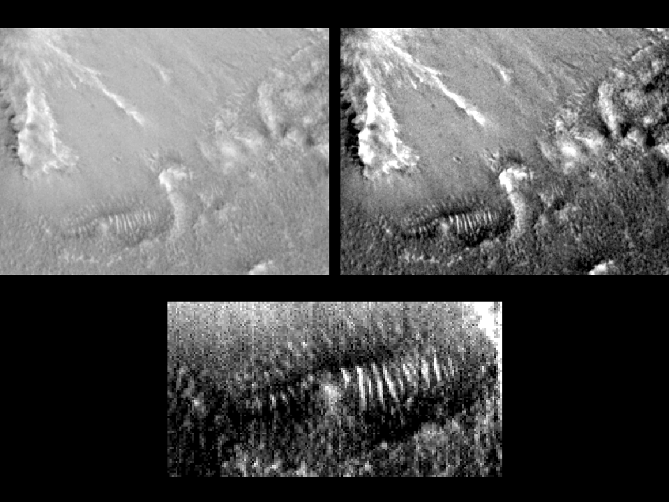 An extract from the top portion of the third MGS-Cydonia strip image taken April 23. This shows an unusual feature with dark stripes or bands. The feature is a few hundred meters long, and somewhat resembles a large lizard. Material sliding down the smooth pyramid-like face behind this object has been suggested as a possible natural explanation. We show it here because, just above (behind?) the dark stripes is an almost identical set of fainter dark stripes, as if a reflection were being seen. Likewise, irregular shapes to the right along the base of this smooth face also have fainter (mirror?) images "behind" them. If these were reflections, the presence of manufactured materials such as glass or metal would be implied.