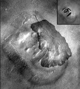Figure 2. Part of MGS image SP1-22003 showing “Face” at Cydonia. Inset locates “facial” features. Contrast is adjusted separately on the two sides, with the sunlit portions outlined. Dark border of outline is an artefact caused by darkening everything inside the outline to bring out its details.