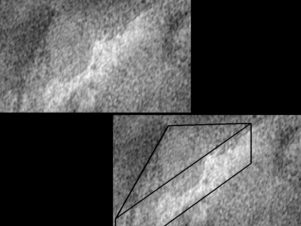 An extract from the top portion of the third MGS-Cydonia strip image taken April 23. This shows an unusual feature with dark stripes or bands. The feature is a few hundred meters long, and somewhat resembles a large lizard. Material sliding down the smooth pyramid-like face behind this object has been suggested as a possible natural explanation. We show it here because, just above (behind?) the dark stripes is an almost identical set of fainter dark stripes, as if a reflection were being seen. Likewise, irregular shapes to the right along the base of this smooth face also have fainter (mirror?) images "behind" them. If these were reflections, the presence of manufactured materials such as glass or metal would be implied.